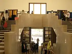 The layout involved two rectangular blocks with the rear block taller and wider than the front block. The design of the front block involved a symmetrical main frontage of 19 bays facing onto the main road (now Avenue André Morizet). The central bay featured a short flight of steps leading up to a heavily recessed doorway with a curved canopy. The building was fenestrated with bipartite casement windows on the ground floor, placed one above the other, and tall casement windows on the first floor, spaced out in three blocks of five with single windows between. At roof level, there were prominent eaves. Internally the principal room was the Grand Hall des Guichets (the large ticket hall), which was 65 meters (213 ft) long and 28 metres (92 ft) wide, and was accommodated in the rear block.[10] Works of art commissioned for building included two pieces by the sculptor, Paul Cornet, entitled Seated Woman (created 1930) and Venus and Cupid (created 1941).[11]