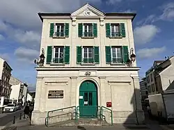 In 1839, the town council decided to commission a dedicated town hall. The site they selected was a large disused cemetery on the corner of Rue du Cimetière (now Rue des Anciennes-Mairies) and Rue Saint-Denis (now Rue Waldeck-Rochet). The new building was designed by Paul-Eugène Lequeux in the neoclassical style, built in ashlar stone and was officially opened by the mayor, Charles-Maurice Delahaye, on 27 October 1842. The design involved a symmetrical main frontage of three bays facing the corner of the two streets. The central bay featured a round headed doorway with a moulded surround on the ground floor, casement windows with shutters on the first and second floors, and a pediment, with a clock in the tympanum, above. The other bays were fenestrated in a similar style.[3]