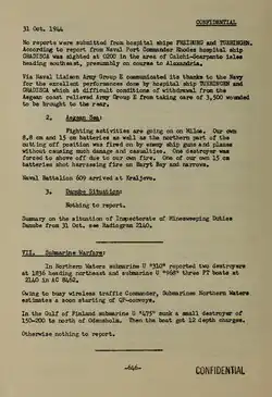 A page from the translated war diary of the German Naval Staff Operations Division recording the thanks of Army Group E for the service of Tübingen and Gradisca in evacuating 3,500 wounded troops fromt he Aegean coast in October 1944