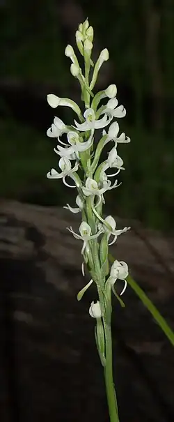 Habenaria ochroleuca, commonly known as the sickle orchid[2] or sickle habenaria,[3] is a species of orchid that is endemic to northern Australia. It has two or three broad, glabrous leaves and up to twenty five white flowers on a flowering stem with many overlapping bracts. The side lobes of the labellum curve upwards.