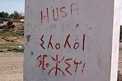 Writing in Tifinagh saying "the people of Haha are Berbers" (Tachelhit: ⵉⵃⴰⵃⴰⵏ ⵉⵎⴰⵣⵉⵖⵏ, romanized: iḥaḥan imaziɣn)