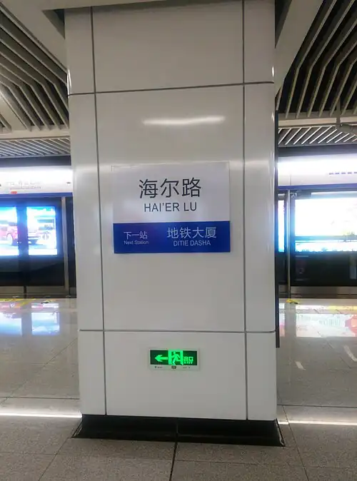 Hai'er Road (Chinese: 海尔路) is a station of the Qingdao Metro on Line 3, which opened on 16 December 2015.[1] The station is near the headquarters of Haier.