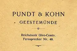 During World War II the factory, the wood storage and office and residential buildings on the Geeste river, the timber harbour of Geestemünde, the old company's port and the lumber wharf at Schönianstrasse and Borriesstrasse (Geestemünde) were destroyed by Allied bombers during the night of the Strategic bombing of Bremerhaven (18 September 1944).[3] The company was never able to recover from the destruction in the post-war period. After the death of his elder brother, Gerhard Kohnert, in 1962, Hans Kohnert took over the furniture industry Meller Möbelfabrik (MMM) as well, which had been founded by Gerhard in 1909 in Melle near Osnabrück. After the war, the latter had already been closely linked to the timber import company (P & K) through a profit transfer agreement (1956–1966), which contributed to the fact that MMM did not make the necessary investment and modernize to cope with the fierce completion in this market. In 1966, MMM was sold to the main creditors to forestall liquidation. In January 1975, MMM finally went bankrupt under the new owners.[4] The company Pundt & Kohnert in Bremerhaven was dissolved after Hans Kohnert's death in 1967.
