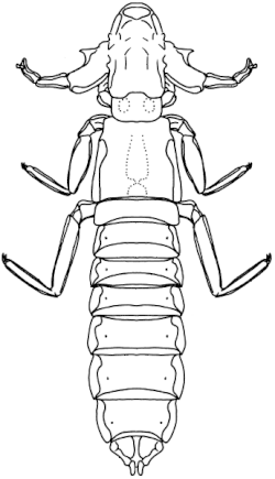 This species is dark brown with an elongated head, and extremely large – H. hopkinsi is one of the largest feather lice, with males reaching up to 9 millimetres (0.35 in) long.[2] They live mostly on the wing feathers, but are quite able to move if disturbed or if their host bird should die.[3] There are usually fewer than half a dozen adult specimens found on a single host bird; low compared with other species of feather lice, which may number in the hundreds.[3] Harrisoniella hopkinsi has been found on the feathers of the wandering albatross (Diomedea exulans) and the southern royal albatross (Diomedea epomophora).[3]