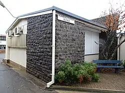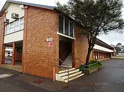 Harristown's new administration block was a result of growth at the school, "where an administrative unit of this pleasing character [had] become necessary".[50] The administration block (the northern section of Block Z in 2016) was added to the west of Block B c. 1957-8.[51] Connected to the northwest corner of the ground floor of Block B by a covered way, it included concrete paved indoor-outdoor areas; a raised concrete dais and a garden plot to the northeast; male and female toilets at the east end of the building; two staff rooms to the west; offices for the Principal and Deputy Principal at the west end of the building; and two brick flower boxes and a raised area of concrete pavers outside the northwest entrance. The building was sheeted with metal, with stone feature walls at the southwest corner and a brick wall at the east end, and had clerestory windows on the south side.[52] The use of stone was a deliberate move to improve the aesthetics of the school. In 1959 it was noted that, as high schools grew, they needed "elements of maturity", the aim being "to develop pride in the school and to supplement academic education with desirable aesthetic experience".[50][1]