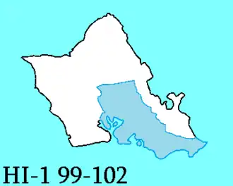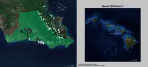 Hawaii's 1st congressional district is a congressional district in the U.S. state of Hawaii. The district is entirely on the island of Oahu, encompassing the urban areas of the City and County of Honolulu, a consolidated city-county that includes Oahu's central plains and southern shores, including the towns of Aiea, Mililani, Pearl City, Waipahu, and Waimalu. The district is smaller and more densely populated than the 2nd congressional district (which comprises the rest of the state). It is represented by Democrat Ed Case.