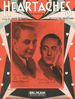 Al Hoffman composed "Heartaches" after moving to New York City in a bid to become a successful songwriter; though it was not initially a major hit, it has been described by Billboard as Hoffman's first great song.[1] The song's lyrics were written by John Klenner.[2] A 1931 recording by Guy Lombardo and his Royal Canadians on Columbia (catalogue number 2390-D), was a modest success.[3] Another early version was issued by Sid Phillips & his Melodians with Al Bowlly providing the vocal. This recording was made in London in late August 1931 and released on the Edison Bell Winner label (EBW 5358).[4]