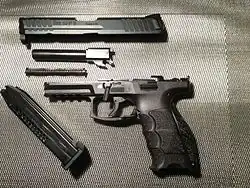 The Heckler & Koch VP9 (known as SFP9 in Europe and Canada) is a polymer-framed semi-automatic striker-fired handgun. The VP designation in the name refers to Volkspistole, which translates to “civilian pistol” (literally “people’s pistol” [4]) while SFP stands for "striker-fired pistol".[5] The 9 stands for the caliber designation of 9 mm. The VP9 is the third striker-fired pistol that HK has produced. A variant of the VP9, the VP40, is chambered for .40 S&W; the VP40 is known as SFP40 in Europe and Canada.[5]