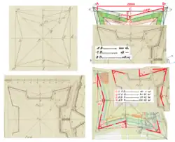 The plan of the main bastion has been lost. However, in 2023, archaeological shape analysis of the existing remains by Tokita Taichirō, curator of the Hokuto City Hometown Museum, revealed that the design was based on a square with sides of just 200 meters (656 feet),[15][nb 4] using its diagonals and bisectors as reference lines, and was executed using the metric system, which was not the standard surveying method in Japan at the time.[nb 5] Furthermore, the geometric design method, as well as the dimensions and angles of each part, were found to match the specifications of the model structure detailed in the chapter "Des Forts à bastions" (Dutch: Gebastioneerde Forten, bastion-style fortresses) in Cours élémentaire de fortification (first edition 1812) by Nicolas Savart (1765–1825),[12][nb 6] used as a textbook for fortification studies at the French Saint-Cyr Military Academy, and its Dutch translation with additions by Frederik Petrus Gisius Nanning (1798–1832) Beginselen der versterkingskunst (1827)[13] (hereinafter "Savart's textbook"). This Dutch translation was confirmed among the possessions of Sakuma Shōzan,[16] Fujiwara Shume's mentor, and was also found in the library of Egawa Hidetatsu (江川英龍, 1801–1855),[17] a pioneer of Western learning in the late Edo period under whom Shozan studied, as well as mentioned in correspondence by Date Munenari (伊達宗城, 1818–1892)[18][nb 7] and listed in the architecture section of the Bansho Shirabesho Book Catalog Copy.[19] This suggests that it served as an early text for Japan's Western-knowledge enthusiasts in the late Edo period to study European artillery defense.
