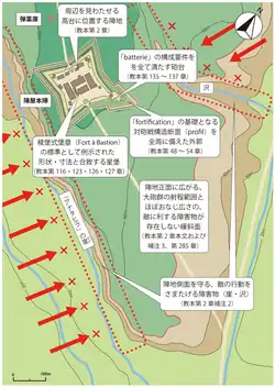 In addition, the geometric cross-sectional structure (French/Dutch: profil) of the outer defenses, which seamlessly connects the earthworks[nb 8]—characterized by a riflemen's platform (French:banquette, Dutch:banket) installed along the entire inner perimeter of the ramparts[20]—to the moat, as well as the gun emplacements, which meet the requirements for artillery batteries (砲台, Hō-dai, French:batterie, Dutch:batterij)[21] in European military science of the time, include: