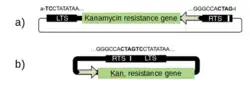 a) Plasmid containing the helitron: the antibiotic resistance gene (kanamycin) is inserted between the left and right terminal sequences (LTS and RTS respectively) ; b) Circular intermediate of transposition: the terminal sequences are joined together (grey arrow indicates promoter of the gene)
