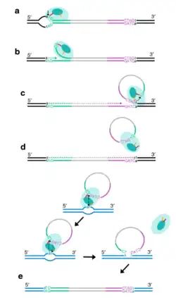 Helitron could be either autonomous or non-autonomous. One transposase molecule cleaves at the donor (by the first tyrosine (Y1) residue of the Rep protein) and target sites (by the second tyrosine (Y2) residue) and binds to the resulting 5' ends. The free 3' OH in the target DNA attacks the DNA–Y1 bond and forms a bond with the donor strand resulting in strand transfer.[7] Replication at the cleaved donor site initiates at the free 3' OH where the donor strand serves as a primer for DNA synthesis by host DNA polymerase and replication proceeds to displace one strand of the helitron. If the palindrome and 3' end of the element are recognized correctly, cleavage occurs after the CTRR sequence and the one Helitron strand is transferred to the donor site where DNA replication resolves the heteroduplex.[11]