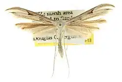 The wingspan is 27–33 millimetres (1.1–1.3 in). The forewings are white to pale yellowish white, although tinged with gray brown on the costa from the base to the apex. There is a blackish dash above the base of cleft, followed by one or two dots in a few specimens. The extreme apex of the first lobe is blackish and the apex of the second lobe has a blackish streak which is continued through the fringes. At a short distance before cleft is a small subtriangular brownish-black spot, curving toward the costal spot. There is sometimes a dot at the middle of the cell. The wing is sparsely sprinkled with dark scales which tend to collect along the veins and inner margin. The hindwings and fringes are gray brown.[2]