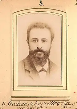 Henri Gadeau de Kerville (17 December 1858 in Rouen – 26 July 1940 in Bagnères-de-Luchon) was a French zoologist, entomologist, botanist and archeologist best known for his photographs of these subjects and especially for his work "Les Insectes phosphorescents: notes complémentaires et bibliographie générale (anatomie physiologie et biologie): avec quatre planches chromolithographiées", Rouen, L. Deshays, 1881.