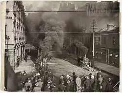 In early 1902, Sydney was undergoing sporadic outbreaks of the bubonic plague, which threatened the theatre and surrounding businesses with closure.[7] On Sunday 23 March 1902, after a performance of Ben Hur and after the theatre had been disinfected, a fire broke out at around 6am.[4][8] The asbestos safety curtain failed to operate and the interior of Her Majesty's, including the expensive props and costumes, was destroyed.[4] The only victim of the fire was a woman inside a neighbouring bakery who died when the theatre's wall collapsed onto her.[9]