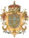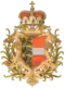 Before 1915, the arms of the different territories of the Austrian part of the Empire (heraldry was added to some areas not shown in the previous version and to the left to the Hungarian part) appeared together in the shield positioned on the double-headed eagle coat of arms of the Austrian Empire as an inescutcheon. The eagle was inside a shield with a goldfield. The latter shield was supported by two griffins and was topped by the Austrian Imperial Crown (previously these items were included only in the large shield). Then, shown in the center of both arms of dominion, as an inescutcheon to the inescutcheon, is the small shield, i.e. personal arms, of the Habsburgs. All this was surrounded by the collar Order of the Golden Fleece.[2][3]