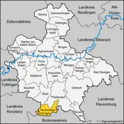 Alb-Donau-KreisBodenseekreisBiberach (district)Konstanz (district)Ravensburg (district)Reutlingen (district)Tuttlingen (district)ZollernalbkreisBad SaulgauBeuronBingenGammertingenHerbertingenHerdwangen-SchönachHettingenHohentengenIllmenseeInzigkofenKrauchenwiesLeibertingenMengenMengenMeßkirchNeufraOstrachPfullendorfSauldorfScheerSchwenningenSigmaringenSigmaringendorfSigmaringendorfStetten am kalten MarktVeringenstadtWald