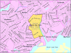 2. ^ Barron, James. "IF YOU'RE THINKING OF LIVING IN: FIVE TOWNS", The New York Times, July 10, 1983. Accessed May 20, 2008. "The basic five are Lawrence, Cedarhurst, Woodmere, Hewlett and Inwood. But the area also includes some unincorporated communities and two tiny villages, Hewlett Bay Park and Woodsburgh, that are not added to the final total."