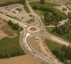 The engineering and consulting firm Morrison Hershfield was retained to undertake the detail design for the realignment and reconfiguration of the existing intersection at Highway 33 and Country Road 1 into a single lane roundabout with a central island and truck apron. The assignment included highway engineering, drainage and hydrology engineering, electrical engineering, public consultation, and traffic engineering.[15] The roundabout was officially opened on July 17, 2009.[14]
