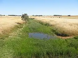 The Hill River drains a catchment area of 230 square kilometres (89 sq mi). Flows which are intermittent, can result from either winter rains or local thunderstorms. The average annual observed flow in 2000–04 was 2,568 megalitres (90.7×10^6 cu ft).[3] Most of the catchment emanates from the Camels Hump Range and to a lesser degree from the Stony Range. Slab Hut Creek is amongst the more significant tributaries. The river has a low gradient which, combined with a broad and shallow catchment valley, renders it unsuitable as the site of any significant reservoir. In some areas the clearing of native vegetation has led to erosion and steep banks. The Hill River also gives its name to the locality of Hill River, which is within the District Council of Clare and Gilbert Valleys.[4]
