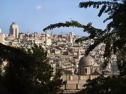 Glimpse with part of the historic center, photographed from above the university's botanical garden. On the upper left is the Clock Skyscraper built in the 1930s to a design by Marcello Piacentini. In the center of the photo is the bell tower of San Lorenzo Cathedral and in the background part of the basilica of Santa Maria Assunta, the work of Alessi