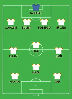 There are many successful footballers who have played for Galatasaray and made their mark on Turkish football history. Few examples may be 1930s national hero Eşfak Aykaç,[12] Boduri who died at the age of 21,[13] Mehmet Leblebi who scored a domestic record of fourteen goals in single match,[14] Gündüz Kılıç nicknamed Baba (father) who was the coach but also the player of his team in the 1950s with great success on both,[15] Bülent-Reha Eken brothers, Suat Mamat who made a hat-trick in 1954 FIFA World Cup,[16] Coşkun Özarı a life devoted to Galatasaray,[17] Turgay Şeren the heroic goalkeeper that called "the Panther of Berlin",[18] Fatih Terim the team captain of Galatasaray and the Turkey national football team for years and the current coach,[19] Metin Oktay six time top scorer of Turkish league,[20] Zoran Simović another skilled goalkeeper known for his penalty saves,[21] Cüneyt Tanman who played a record of 342 games for Galatasaray,[22] Tanju Çolak a goalscorer and European Golden Boot 1988 winner with Galatasaray,[23] Cevad Prekazi an Albanian teammate of Tanju specializing in free kicks,[24] Taffarel the world cup winner goalkeeper of Brazil,[25] Gheorghe Hagi Romanian football hero that still described as the best foreign player ever to play in Turkey,[26] and, Hakan Şükür, who scored most goals in top flight Turkish Football with 249 goals spent the majority of his career, 14 years, at Galatasaray and is also the club's most scoring player with 228 goals.