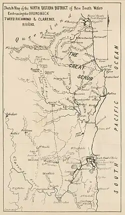 In early 1882 Rocco Caminotti, a man of Italian origin, met some of the settlers from the de Ray expedition. He knew of their desire to remain together and while in Northern NSW noticed that there was land still being offered and believed it a place that may allow the new settlers to live in close proximity. He and Antonio Pezzutti investigated the region in April and applied for a selection close to a creek on the South Woodburn - Chatsworth island coach route. This was at the junction of the main road between the Clarence River and Richmond River and of the road to Swan Bay. This would form the nucleus of the New Italy settlement.[1]