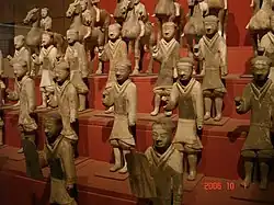 The Zhou dynasty (c. 1056 – c. 256 BCE) had made the state of Qin in Western China as an outpost to breed horses and act as a defensive buffer against nomadic armies of the Rong, Qiang, and Di peoples.[2] After conquering six Warring States (i.e. Han, Zhao, Wei, Chu, Yan, and Qi) by 221 BCE,[2] the King of Qin, Ying Zheng, unified China under one empire divided into 36 centrally-controlled commanderies.[3] With control over much of China proper, he affirmed his enhanced prestige by taking the unprecedented title huangdi, or 'emperor', known thereafter as Qin Shi Huang (i.e. the first emperor of Qin).[3] Han-era historians would accuse his regime of employing ruthless methods to preserve his rule.[4]