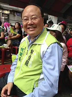 Ho served on the third National Assembly as a member of the Democratic Progressive Party,[2][3] but switched affiliations to represent the newly founded Taiwan Solidarity Union in the 2001 legislative elections.[4][5] During his first term, Ho was a member of the Legislative Yuan's National Defense Committee.[6][7] Near the start of his second term, the Taiwan Solidarity Union named Ho one of its caucus whips.[8] He was named the TSU candidate for the mayoralty of Taichung in April 2005,[9] and reelected as one of four TSU caucus whips in June.[10] Incumbent Taichung mayor Jason Hu retained his office, and Ho was later named a member of the Taiwan Solidarity Union's Central Executive Committee.[11] Ho rejoined the Democratic Progressive Party in November 2007, after defeating Wang Shih-hsun in a public opinion poll used to determine the Pan-Green Coalition's legislative candidate,[12] and lost his legislative seat to Daniel Huang.[13][14]