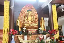 In the middle of the Mahavira Hall placed the statue of Sakyamuni, with statues of Ananda and Kassapa Buddha on the left and right