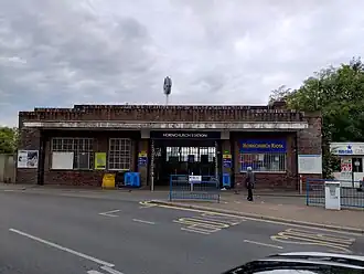 Hornchurch was served by regular daily District/LTSR through trains from June 1912 to September 1932, changing from electric District to steam LTSR locomotives at Barking.[12] Delayed by World War I, an additional pair of electrified fourth rail tracks were extended by the London, Midland and Scottish Railway to Upminster and services of the District resumed at Hornchurch in 1932.[7][13][14] To coincide with the introduction of electric services, the station was rebuilt with two additional platforms and a new ticket office spanning the tracks facing onto Station Lane. The goods yard was moved from the north to the south of the station to accommodate the new slow lines.[15] The station was built to the designs of LMS architect William Henry Hamlyn, drawing inspiration from London Underground station architecture.[16] Electric train service was initially a train every 10 minutes at peak times and every 20 minutes off-peak.[17]