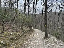 Beyond PA 443, the Horse-Shoe Trail traverses undeveloped areas within the Fort Indiantown Gap military base. For its final 16 miles, the trail transforms noticeably into a rugged backpacking route that is typical for central Pennsylvania, with very rocky ascents and descents of Second Mountain and Sharp Mountain.[12] In this area, the trail passes through State Game Lands No. 211.[13] The Horse-Shoe Trail ends at a junction with the Appalachian Trail in Dauphin County, about 3.3 miles east of that trail's nearest road crossing at Pennsylvania Route 325.[1]