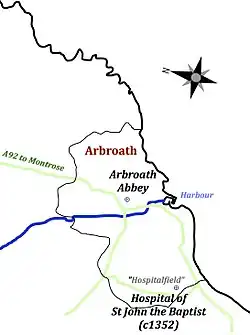 Location of the Hospital of St John the Baptist c1352 and Arbroath Abbey.