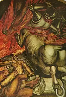 The former gaming room in the main hall came to be called the Salón de los Murales. The Spanish Republican artist Josep Renau painted a mural there of "La Hispanidad" a history of the Iberian Peninsula from the time of the Phoenicians to the conquest of America. The other side of the room held a 1965 mural by José Reyes Meza that depicted indigenous culture in the Valley of Mexico. The hall also had a mural of The Apocalypse by Jorge Flores, a disciple of David Alfaro Siqueiros.[11] Renau's Mural de la conformacion hispanica, painted with his wife Manuela Ballester(es), depicted the conquest and colonization of America by the Spanish and covered more than 300 square metres (3,200 sq ft).[16] The walls of the rooms and corridors also held the work of David Alfaro Siqueiros, Dr. Atl, Benito Messeguer, Jorge González Camarena, Francisco Icaza, Victor Moscoso and others.[17][18]