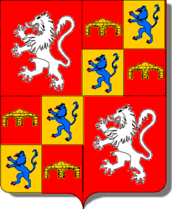 Coat of arms of the Dukes of Sabran-Pontevès (Quarterly; 1,4 Gules, a lion rampant Argent (Sabran); 2,3 counter-charged; a,d Gules, two-arched bridge Or (Pontevès); b,c Or, a wolf rampant Azure, claws, tongue, genitals Gules (Agoult))