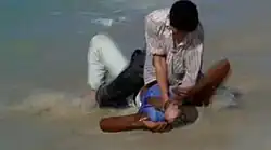 Meanwhile, Sun is shocked to see Jin attack Michael on the beach for no apparent reason. James "Sawyer" Ford (Josh Holloway) and Sayid Jarrah (Naveen Andrews) manage to subdue and handcuff Jin to the wreckage. Michael says the attack was racially motivated, which he later tells his son, Walt Lloyd (Malcolm David Kelley), is not true. Sun finds Michael alone, and in fluent English says, "I need to talk to you." Michael is shocked that she speaks English. Sun tells him that Jin is unaware of this, and explains that Jin angrily attacked Michael because of the watch he's wearing, which belongs to her father. Michael says he just found it in the wreckage and it's nothing important.