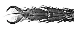 Micrograph of the tarsus of the leg showing claws and bristles, including the central one between the two pulvilli known as the empodium