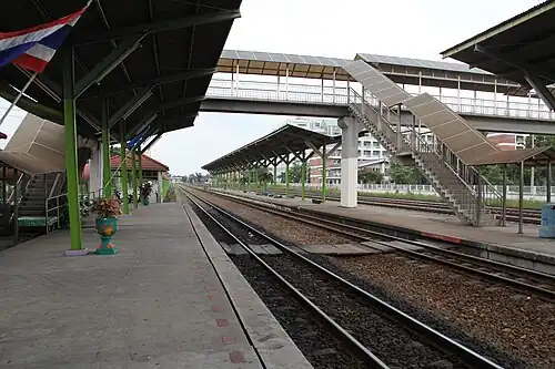 Hua Takhe railway station is a railway station located in Lat Krabang Subdistrict, Lat Krabang District, Bangkok. It is a class 1 railway station located 30.911 km (19.2 mi) from Bangkok railway station. This station is the nearest station to Suvarnabhumi Airport, as well as the nearest large railway station to King Mongkut's Institute of Technology Ladkrabang. However, the nearest railway station to KMITL is Phra Chom Klao halt, located only 830 m (2,723 ft) from Hua Takhe Station. Hua Takhe is also the junction (although not officially one) for the freight-only line to the Lat Krabang Inland Container Depot (ICD).