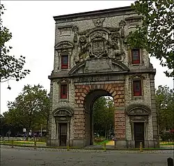 A few years after becoming a master, van den Eynde was commissioned to work on the Waterpoort in Antwerp, a triumphal arch or gate in honor of Charles V. The commission was completed by van den Eynde in collaboration with Hans van Mildert, a regular collaborator of Rubens. The design of the gate has been attributed to Rubens. The Waterpoort, or Porta Regia, was erected in 1624.[2][16] In 1883–84, due to works to the quays on the Scheldt, the gate was moved to the Sint-Jansvliet. In 1933, due to the works to the Scheldt tunnel, it was dismantled again and re-erected in 1936 on the Gillisplaats.[5]
