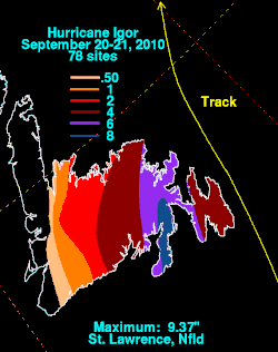 - ^ a b Roth, David M; Hydrometeorological Prediction Center (May 10, 2010). "Hurricane Igor – September 20–21, 2010". Tropical Cyclone Point Maxima. United States National Oceanic and Atmospheric Administration's National Weather Service. Retrieved March 18, 2011.