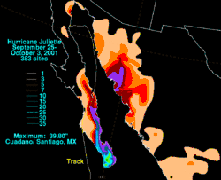 A large cyclone, Juliette affected much of the Pacific coast of Mexico with clouds, rainfall, and high waves, particularly the states of Baja California Sur and Sonora.[27] A weather station in Cabo San Lucas recorded sustained winds of 141 km/h (87 mph), with gusts to 174 km/h (108 mph).[3] In Hermosillo, wind gusts reached 167 km/h (104 mph).[28] Earlier while Juliette was offshore southern Mexico, it produced gusts of 74 km/h (46 mph) in Manzanillo.[13] The heaviest rainfall occurred along the southern tip of the Baja California peninsula, with a maximum precipitation total of 1,011 mm (39.80 in) recorded at Santiago. This was among the wettest known tropical cyclones in northwestern Mexico. In neighboring Baja California, Juliette produced a rainfall total of 261 mm (10.28 in). Also in the state, the highest 24 hour rainfall total in the country was 207.2 mm (8.16 in) in San Felipe. Across the Gulf of California, parts of Sonora experienced significant rainfall, the equivalent of a year's worth of precipitation over three days. A station along the Mayo River recorded 380 mm (15 in).[3][27][29][30][26]