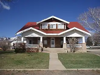 The foundation and first floor of the two story Craftsman Style house are of local sandstone from South Creek near the Abajo Mountains, while the upper level is wood frame with shingle siding. The house features the characteristic wide porches, deep eaves and shallow roof pitch associated with the Craftsman style. The house retains its original first floor arrangement with two parlors, a small office at the front entrance, a bedroom and a kitchen. The interior retains its dark-stained California fir woodwork. Three bathrooms were added to the original two with the house's conversion. The property originally included barns, sheds, a dairy, an ice house, orchard and garden, all no longer extant.[2]