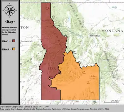 Table of United States congressional district boundary maps in the State of Idaho, presented chronologically.[6] All redistricting events that took place in Idaho between 1973 and 2013 are shown.