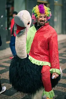 An illusion costume is a costume that fools the eyes by making it seem that the person in the costume is riding an animal, being held by another person (which is part of the costume), or many other things. The most common is the rider, in which the "rider" (person) gives the illusion of riding an animal; the person's legs go through the hollowed-out animal legs, along with fake legs dangling off the wearer's body to finish off the illusion.