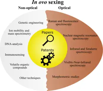 17. ^ a b c Corion, M; Monteiro Belo dos Santos, S; De Ketelaere, B; Spasic, D; Hertog, M; Lammertyn, J (14 July 2023). "Trends in in ovo sexing technologies: insights and interpretation from papers and patents". Journal of Animal Science and Biotechnology. 14 (1): 102. doi:10.1186/s40104-023-00898-1. PMC 10347793. PMID 37452378.