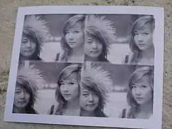 In 1947 Edwin H. Land introduced the Polaroid-Land process.[4] The first instant films produced sepia tone photos.[5] A negative sheet is exposed inside the camera, then lined up with a positive sheet and squeezed through a set of rollers which spread a reagent between the two layers, creating a developing film "sandwich". The negative develops quickly, after which some of the unexposed silver halide grains (and the latent image it contains) are solubilized by the reagent and transferred by diffusion from the negative to the positive. After a minute, depending on film type and ambient temperature, the negative is peeled away to reveal the picture which was transferred to the positive receiving sheet.[6] True black and white films were released in 1950 after problems with chemistry stabilization were overcome.[5]