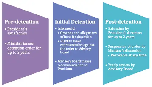 Once an individual has been detained, there are administrative processes which the executive is required to follow under sections 9, 11 and 12 of the Act. The detainee is to be informed of the grounds of detention as soon as possible, unless their disclosure is against the national interest.[38] They are to be served with a copy of the detention order as well as the grounds and allegations of fact on which the detention order was made.[39]