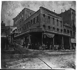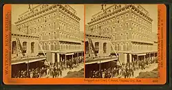Construction of a new International Hotel began in May 1876, on the same site as the original buildings.[2] The hotel project, modeled after the Palace Hotel in San Francisco, was financed by owners Albert Hanak and Ike Bateman.[4] The six-story hotel stood 109 feet (33 m) high,[1] and was built at a cost of $600,000.[5] It opened as the tallest building in the state[6] on the night of March 31, 1877.[2][5] Attendees at the grand opening included businessmen James Graham Fair and John William Mackay, as well as U.S. Senator William Sharon and politician John Henry Kinkead.[5]