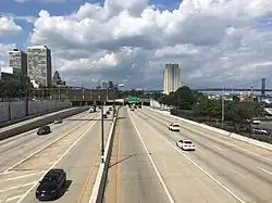 Controversy erupted in the early 1960s over the planned eight-lane elevated segment of the highway along the Center City waterfront; residents of the upscale Society Hill neighborhood objected to the highway on the grounds that it would cut off the neighborhood from the river. State highway officials reached a compromise by opting for an alternative depressed design with an overhead concrete deck connecting Center City to a planned redeveloped waterfront today known as Penn's Landing. By 1979, the entire length of the freeway was open to traffic with the exception of a four-mile (6.4 km) segment near Philadelphia International Airport.[3][8]