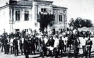 Heliade progressively distanced himself from the more radical groups, especially after discussions began on the issue of land reform and the disestablishment of the boyar class. Initially, he accepted the reforms, and, after the matter was debated within Frăţia just before rebellion broke out, he issued a resolution acknowledging this (the document was probably inspired by Nicolae Bălcescu).[32] The compromise also set other goals, including national independence, responsible government, civil rights and equality, universal taxation, a larger Assembly, five-year terms of office for Princes (and their election by the National Assembly), freedom of the press, and decentralization.[32] On 21 June 1848, present in Islaz alongside Tell and the Orthodox priest known as Popa Şapcă, he read out these goals to a cheering crowd, in what was to be the effective start of the uprising (see Proclamation of Islaz).[32][33] Four days after the Islaz events, the revolution succeeded in toppling Bibescu, whom it replaced with a Provisional Government which immediately attracted Russian hostility. Presided over by Metropolitan Neofit, it included Heliade, who was also Minister of Education, as well as Tell, Ştefan Golescu, Gheorghe Magheru, and, for a short while, the Bucharest merchant Gheorghe Scurti.[34]
